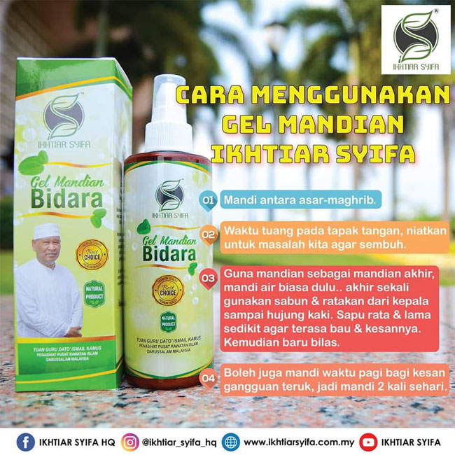 Gel Mandian Bidara - digunakan utk sapu pd seluruh badan ketika mandi kerana jin ada yg bersifat keluar-masuk, ada yg berlari-lari @ berpindah-pindah dlm badan. jadi bila gunakan mandian ni dari hjg rambut sampai hujung kaki, insyaAllah ia akan terkena kesannya pada jin tersebut di mana pun ia berada dlm badan.