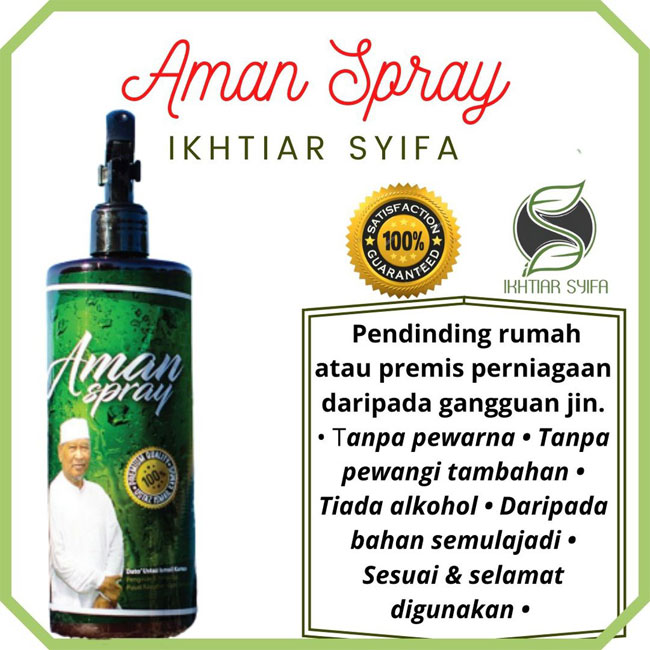 Aman Spray - khas utk gangguan di rumah atau dijadikan spray pagar/pendinding rumah. permulaan spray 7 hari berturut2, selepas tu boleh selang-selikan penggunaan. sangat disyorkan utk mereka yg nak masuk rumah baru @ yg ada tandaยฒ gangguan di rumah seperti nampak kelibat, bunyi guli, bunyi perabot dialihkan dll.